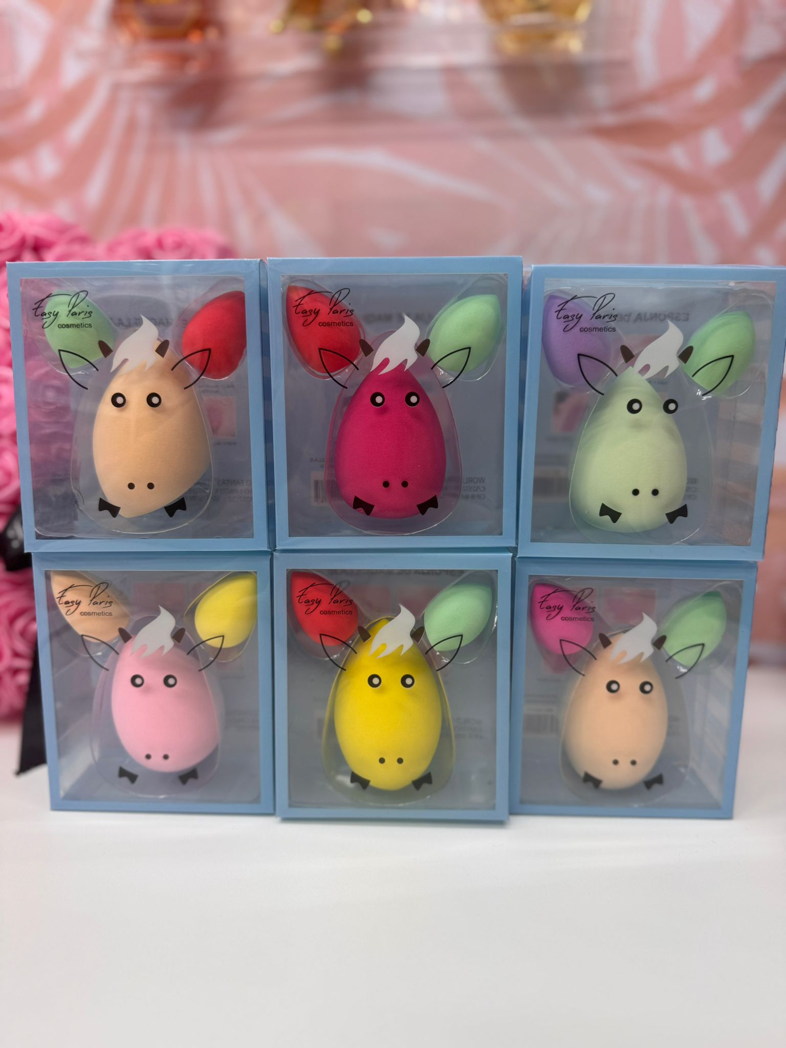 Este es un set de esponjas de maquillaje con diseño de vaca de la marca Easy Paris Cosmetics. El paquete incluye tres esponjas de diferentes formas y colores, diseñadas para la aplicación de base líquida, cremas o polvos.